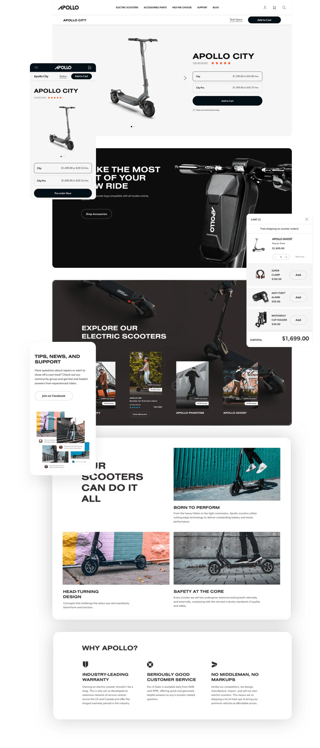 Our collaboration with Apollo Scooters came about naturally, as we’ve previously worked on their mobile application’s interface and usability. This time, the Canadian electric scooter manufacturer needed a mobile-first redesign of their e-commerce store. We worked closely with the client to understand their needs and objectives, which allowed us to develop a solution that went beyond what they had envisioned.